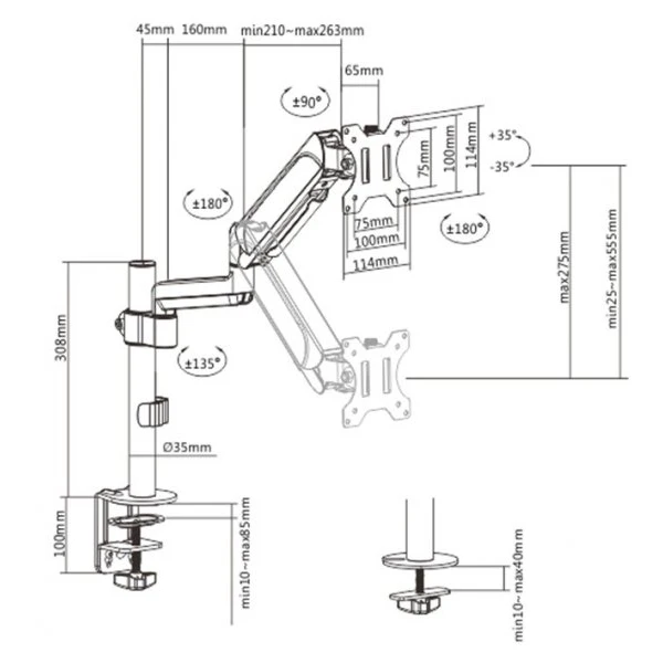 ● Кронштейн обертається, висувається та втягується, нахиляється для зміни кута читання та дозволяє повертати дисплей з альбомного положення до портретного тощо;