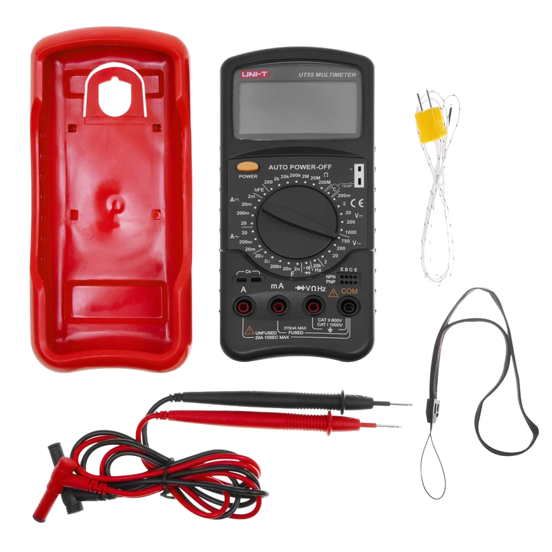 Високоякісний багатофункціональний цифровий мультиметр. Цей зручний портативний пристрій живиться від 9-вольтної батареї. У мультиметрі UNI-T UT55 передбачені функції автоматичного відключення, вимірювання різних параметрів (напруга, струм, опір, ємність, частота, температура) та тести (тестування діодів, перевірка транзисторів, продзвонювання ланцюга).