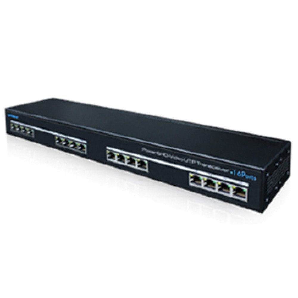 16-канальний приймально-передавач HD відео сигналу і живлення за UTP кабелю CAT5e / Cat6 на відстань до 300 метрів. Підтримує відеостандарти: HDCVI, HDTVI, AHD і аналоговий. Кожен канал має захист від короткого замикання, перевантаження по струму. Живлення: DC 12-24В; Розмір: 430x83x44 мм